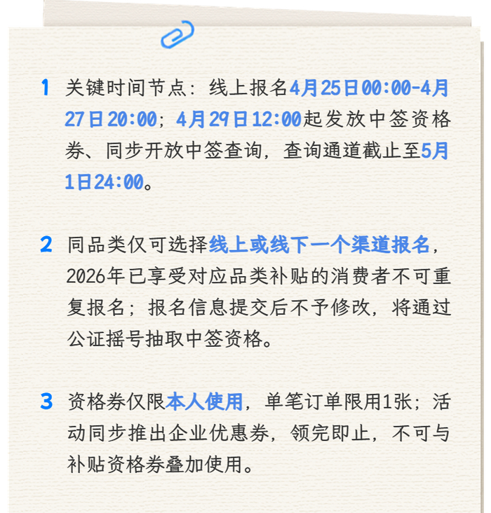 消费者可在规定时段内登录服务机构应用程序APP选择所需品类报名。消费者可在线上专区选择多品类报名,报名时如该消费者2026年已参加活动并享受补贴,则不能参加相应品类的报名,同品类只能选线上或线下一个专区参加活动。报名信息一经提交,不予修改。