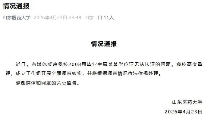 山东医药大学通报“展某某学位证无法认证”:开展全面调查核实4月23日晚,山东医药大学发布情况通报:近日,有媒体反映山东医药大学2008届毕业生展某某学位证无法认证的问题。山东医药大学高度重视,成立工作组开展全面调查核实,并将根据调查情况依法依规处理。日前,展先生向记者反映称,自己多年前从滨州医学院(现更名山东医药大学)毕业后,凭借毕业证和学位证一直正常参加工作,却在去年换工作时突然被告知其学位证“无效”,导致无法顺利入职。展先生从校方获悉,他的学位证“从未被授予”。为了弄清自己手中的学位证真假,展先生对自己进行了举报,希望能通过相关单位倒查的方式,证实学位证的真伪。(光明网、山东医药大学)