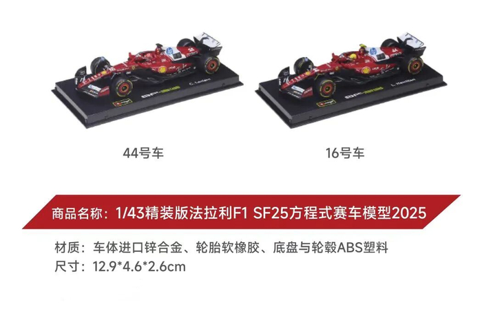 1/43精装版法拉利F1 SF25方程式赛车模型2025精准还原了2025赛季勒克莱尔/汉密尔顿的座驾,做工精良、细节逼真,实乃赛车“发烧”收藏必备。