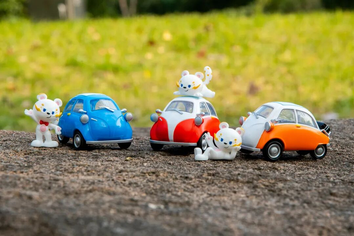 上海汽车博物馆IP形象——BaoBao,萌态可掬、灵动俏皮,搭配复刻经典的Isetta车型车模,置于透明展示盒中,仿佛一个微缩的景观世界,是车模爱好者与潮玩收藏家的心动好物。