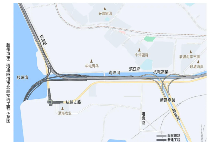 胶州湾第二隧道是全市高快速路网络的重要组成部分。对于加强胶州湾东西两岸交通联系、优化城市空间结构具有重要意义。本项目为胶州湾第二海底隧道市北端接线工程,设置一座T型互通式立交实现隧道主线与杭鞍高架及新冠高架、环湾路快速交通联系,并预留与温州路-重庆路衔接条件。