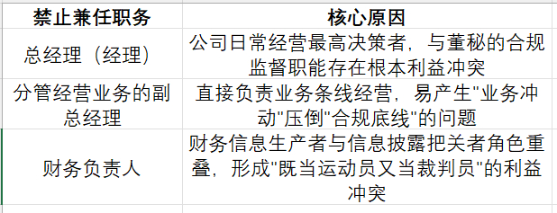 为什么不禁止其他兼职?规则第26条同时明确,董秘兼任其他职务的,应当明确区分职责,确保有足够的时间和精力独立履职。《规则》并非"一刀切"禁止所有兼职,而是精准隔离三类与董秘监督制衡职能存在根本利益冲突的关键岗位。