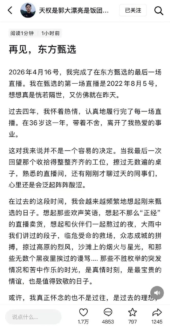 东方甄选4名主播同日宣布离职!均提到不适应公司新变化,感谢俞敏洪