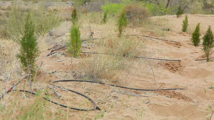腾格里沙漠南缘的甘肃省武威市古浪县八步沙林场内,细密水滴顺着滴灌管网精准渗入沙土,滋养着梭梭、花棒、沙棘等各类沙生苗木。依托2025年4月引黄河水建成的50万立方米蓄水池,八步沙林场在今年春季开始铺设高效节水滴灌工程,尝试以滴灌技术破解沙漠灌溉难题,持续巩固防沙治沙成果,筑牢西部生态安全屏障。