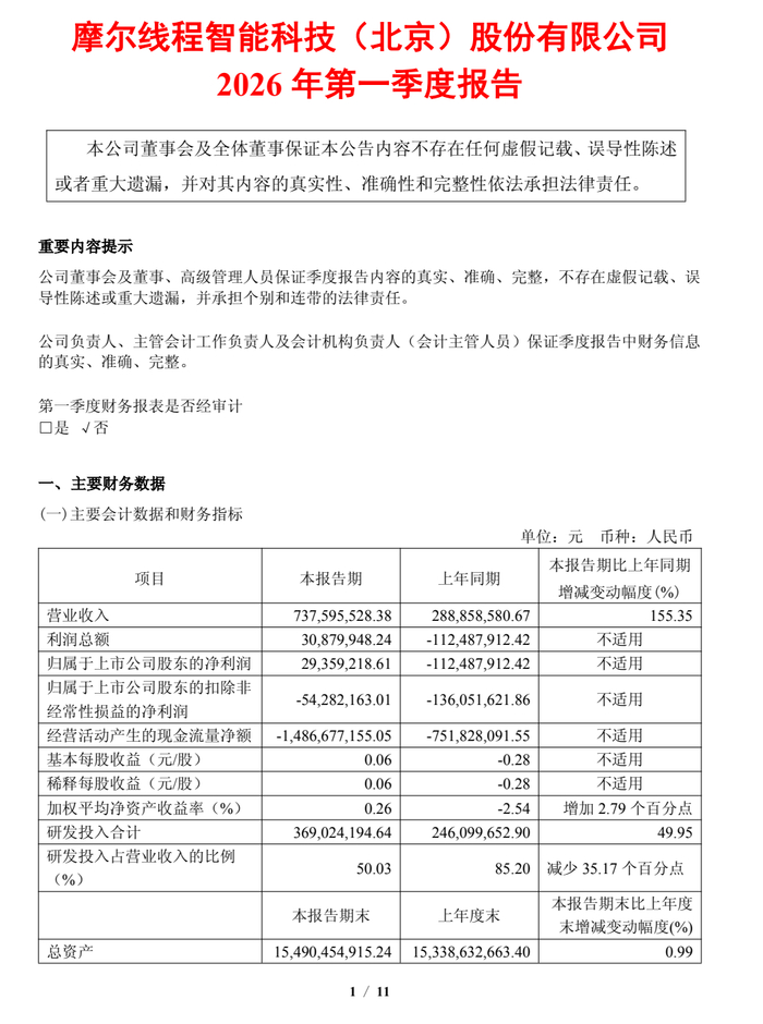 4月26日,国产GPU龙头摩尔线程披露了2025年报及2026年一季报。根据公告,摩尔线程2026年第一季度实现营收7.38亿元,同比增长155.35%;实现归母净利润2935.92万元,同比扭亏为盈。