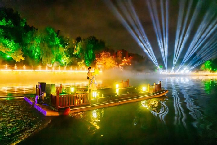 同一种“活化”文脉的手笔,在扬州古运河上演着别样的精彩。在全国首创的“行进式游船+岸线光影科技+实景演艺”模式中,《大运扬州》将2500年的运河史浓缩在60分钟的航程里。船行水上,两岸全息水幕骤亮,李白仗剑吟诗、吴王夫差开凿邗沟的恢弘景象扑面而来。这里的历史不再是冰冷的展品,而是可以与之对望、共情的精神纽带。