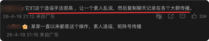 在徐洁云微博的留言区,有网友表示:“它们这个造谣手法很高 ,让一个素人乱说,然后复制聊天记录在各个大群传播。”