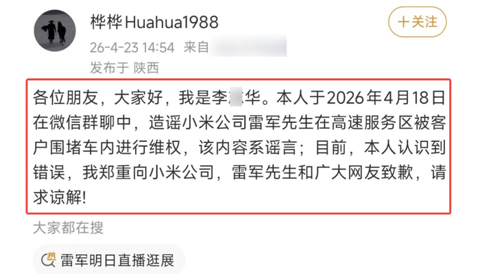 4 月 23 日,李某华公开发帖致歉,并请求小米原谅。
