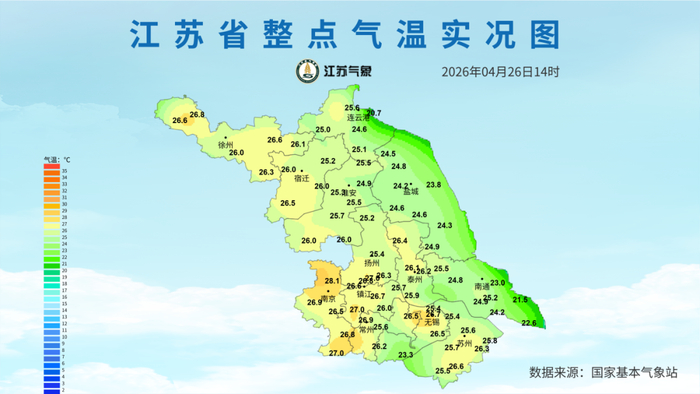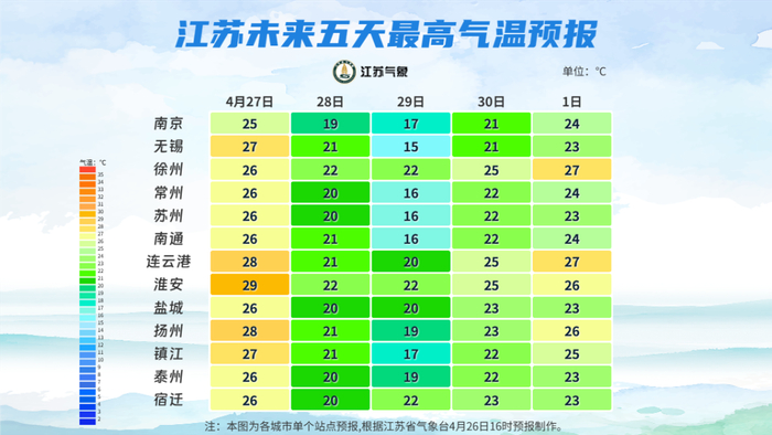 最高温度:淮北地区28~29℃,苏南地区25~26℃,其他地区27℃左右;最低温度:江淮之间东部地区13℃左右,其他地区15~16℃。全省东南风4级左右转西到西北风4—5级阵风6级,有雷雨地区雷雨时短时阵风7—9级。