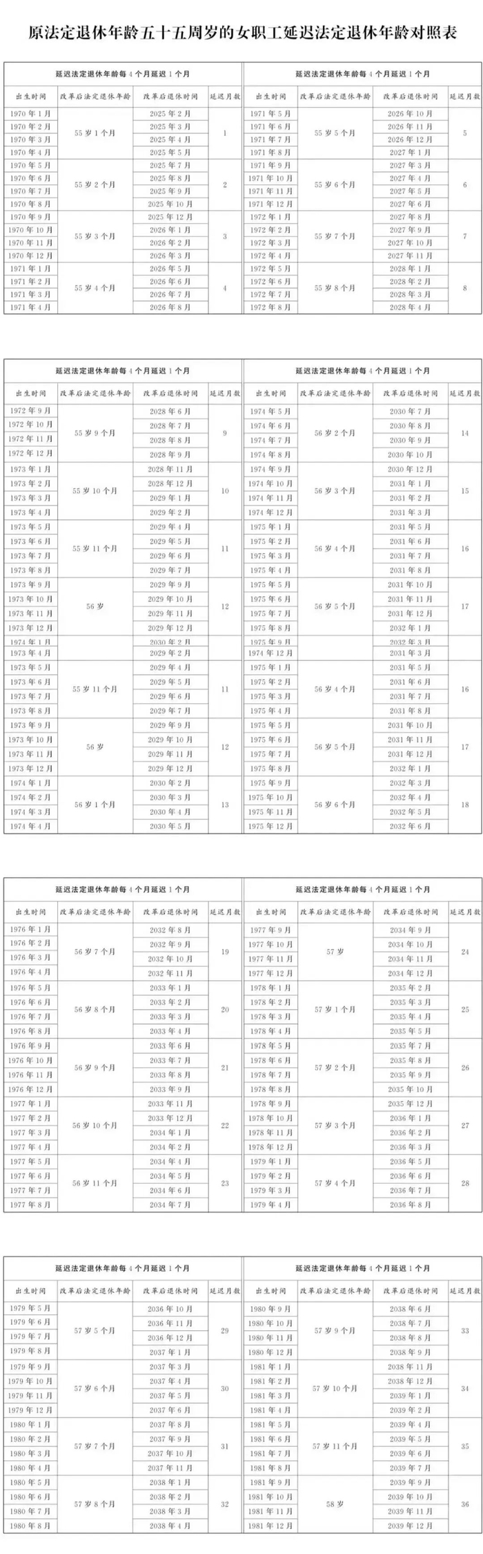 退休年龄对照表