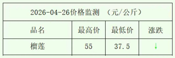 据南环桥市场26日发布的价格监测数据,目前,榴莲批发价呈下降趋势,最高为27.5元/斤,最低为18.75元/斤。