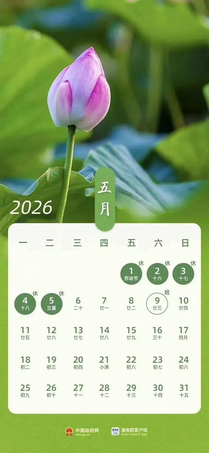 2026年“五一”假期为2026年5月1日至5月5日,共5天。特别提醒,根据《重大节假日免收小型客车通行费实施方案》规定,“五一”假期高速公路对7座及以下小客车实施免费通行。