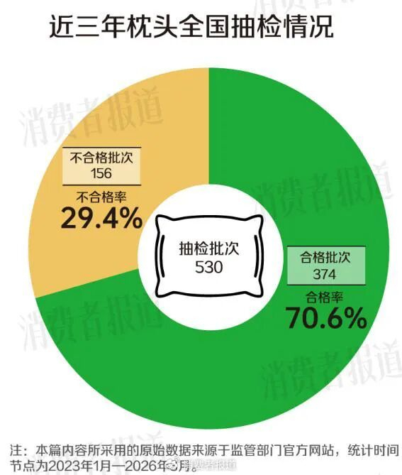 结果显示,监管部门共抽检枕头530批次,156批次不合格,合格率为70.6%。