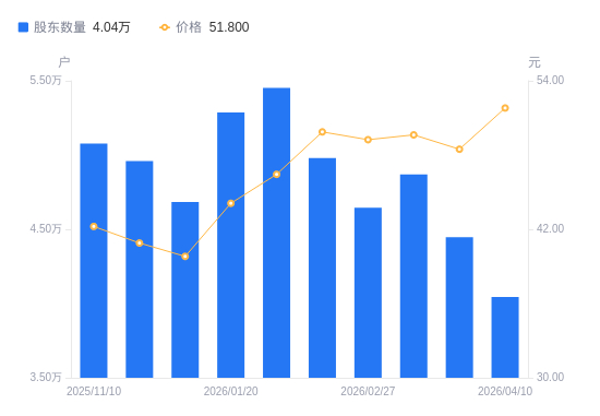 4月26日消息,数据显示,截至2025年12月31日,润建股份A股股东总户数为4.68万户,较上期(2025年12月10日)减少2750户,降幅5.55%。公司最新A股总股本为2.84亿股,其中流通A股2.11亿股,户均持有流通A股数量为4495.51股,较上期增加249.31股,增幅5.87%;户均持流通A股市值17.9万元,较上期增加5339.03元,增幅3.07%。