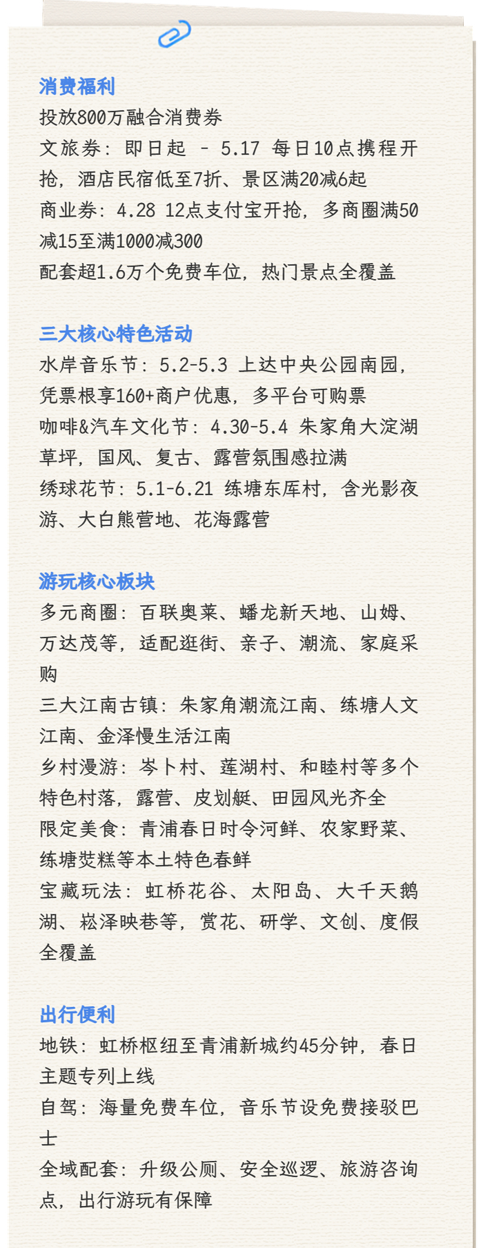 青浦区新闻办介绍,这届“五一”,青浦是懂“宠粉”的:800万消费券管够领,1.6万免费车位管够停,音乐节🎶、花海💐、咖啡☕、古镇🏯、乡野⛺、商圈🏪……吃住行游购娱,一张券全给你打包~不用远行,江南在你家门口↓