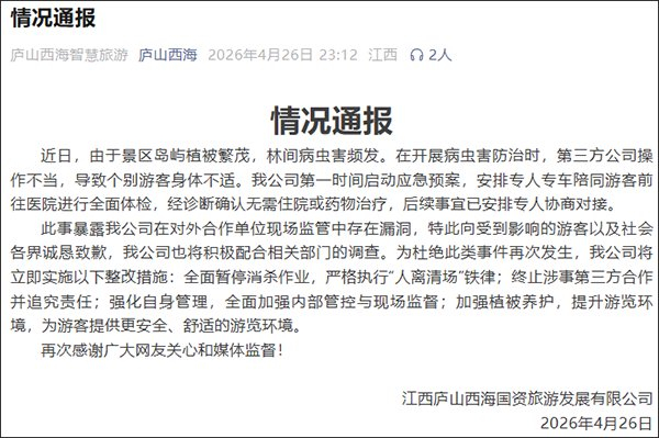 江西庐山西海国资旅游发展有限公司微信公众号“庐山西海”4月26日发布情况通报称,近日,由于景区岛屿植被繁茂,林间病虫害频发。在开展病虫害防治时,第三方公司操作不当,导致个别游客身体不适。我公司第一时间启动应急预案,安排专人专车陪同游客前往医院进行全面体检,经诊断确认无需住院或药物治疗,后续事宜已安排专人协商对接。