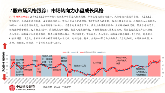 市场风格跟踪:25年4月至5月份市场核心热点集中于贸易战相关题材,市场主题投资行情盛行,风格延续小盘成长占优。 7月至8月,市场回暖,上证指数屡创新高,成交额维持高位,市场小盘成长更具弹性。9月市场进入调整期,热点转移至半导体、人形机器人和新能源。10月初,中美关系预期反复,热点围绕军工和稀土。10月中旬至11月中下旬,热点主要围绕涨价和十五五规划双线逻辑,聚焦于存储芯片、锂电池和量子科技。12月初至1月初,前期热点板块调整,机器人迎来收购潮,可控核聚变进入技术突破期,商业航天政策与产品双催化,无人驾驶、脑机接口加速商用落地,热点主线围绕机器人、可控核聚变、商业航天、无人驾驶、脑机接口概念板块。1月中旬,商业航天、AI应用调整。2月底,中东地缘政治对市场造成一定扰动,电网设备、能化、金属和AI算力为主要热点。3月底至4月,地缘扰动减弱,AI算力、新能源、创新药、半导体均具备景气逻辑。