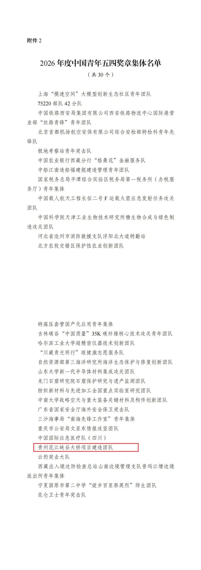 4月27日,共青团中央、全国青联颁授2026年度中国青年五四奖章暨新时代青年先锋奖,贵州花江峡谷大桥项目建造团队荣获2026年度中国青年五四奖章集体,贵州省的王玉茜等23人荣获新时代青年先锋奖。详细报道如下: