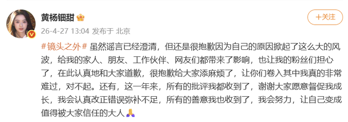 4月27日,黄杨钿甜在微博发文表示:虽然谣言已经澄清,但还是很抱歉因为自己的原因掀起了这么大的风波,给我的家人、朋友、工作伙伴、网友们都带来了影响,也让我的粉丝们担心了,在此认真地和大家道歉,很抱歉给大家添麻烦了,让你们卷入其中我真的非常难过,对不起。还有,这一年来,所有的批评我都收到了,谢谢大家愿意督促我成长,我会认真改正错误弥补不足,所有的善意我也收到了,我会努力,让自己变成值得被大家信任的大人。