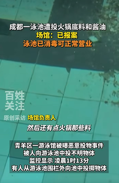 四川成都一泳池凌晨遭人投掷火锅底料,场馆负责人:已完成清洁和消毒,发现异常后已报警,投掷者身份及动机正在调查中