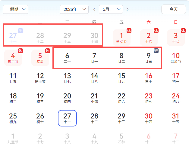 5月6日(周三)返岗上班,5月9日(周六)正常上班,这一天前记得定好闹钟,提前和同事、家人做好提醒,避免耽误工作!