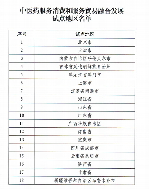 贯彻落实党中央、国务院关于创新提升服务贸易、推动服务消费高质量发展、促进中医药传承创新发展的部署要求,商务部、中央宣传部、文化和旅游部、市场监管总局、体育总局、国家中医药局正组织开展“源自中国、泽被世界:中医药服务消费和服务贸易融合发展试点”工作,确定18个地区为中医药服务消费和服务贸易融合发展试点地区。