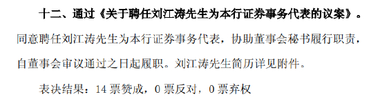 4月27日金融一线消息,北京银行发布公告称,董事会同意聘任刘江涛为该行证券事务代表,协助董事会秘书履行职责,自董事会审议通过之日起履职。