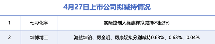 4月27日增减持汇总:七彩化学等2股拟减持,暂无A股增持(表) 新浪证券 新浪证券官方账号 04.2722:06 关注 据统计,4月27日,盘后,七彩化学、坤博精工在内的2家A股上市公司披露拟减持情况。当日暂无A股公司披露增持情况。
