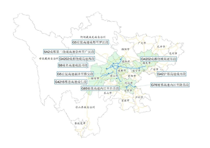 从区域分布看,预计2026年“五一”假期高速公路网车流量在成都平原、川南等人口稠密地区集中特征明显。全省高速公路流量排名前十的市(州)包括:成都、宜宾、泸州、乐山、南充、德阳、眉山、绵阳、内江、达州。从路段分布看,预计2026年“五一”假期高速公路网车流量主要分布在成都绕城环线及其部分放射线路段、川南地区个别路段。