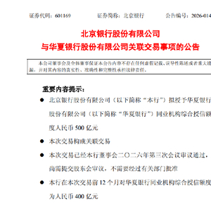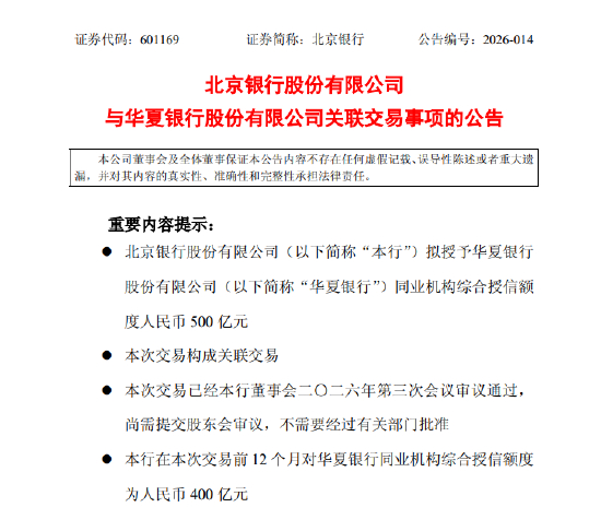 北京银行:拟授予华夏银行同业机构综合授信额度500亿元