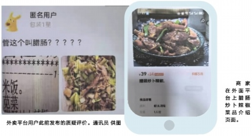 法院审理查明,在江某下单前数日,已有其他消费者在外卖平台对该菜品发表“管这个叫腊肠?”的评价表示质疑,并附上实物图片,但该餐饮公司未及时对商品信息进行修正或说明,也未下架涉事菜品,仍继续对外售卖。