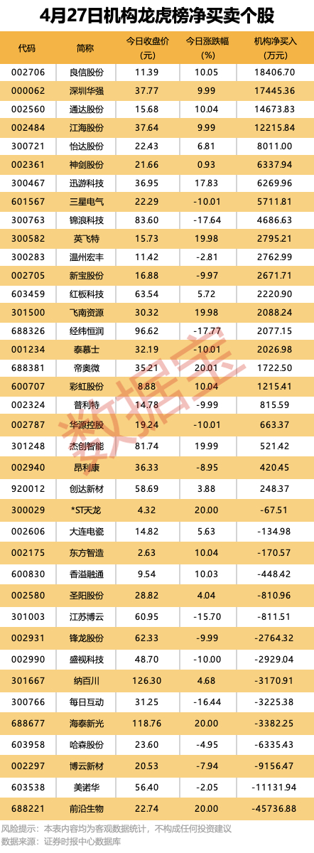 今日龙虎榜中,净买入个股为23只,净卖出的个股为15只。18股净买入金额均超千万元,良信股份获机构净买入1.84亿元,居首。深圳华强、通达股份和江海股份机构净买入金额均超1.2亿元。
