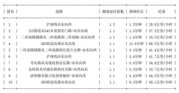 昆明道路拥堵排行榜top10: