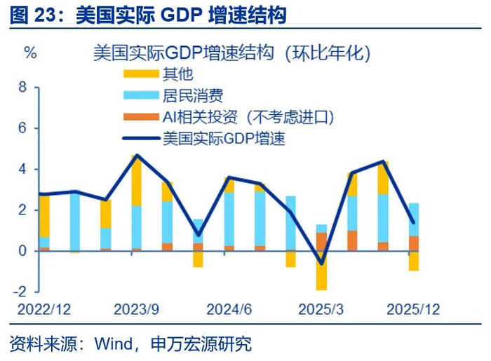 剔除AI相关商品后,各地区出口并未明显走强,甚至有所回落。2026年一季度,韩国出口增速较2025年回升29.5个百分点至37.8%,剔除AI出口后,同期韩国出口增速仅回升5.9个百分点至6.0%。2025年,东盟及印度出口增速较2024年回升2.1个百分点至7.7%,剔除AI出口后,东盟及印度出口增速回落0.6个百分点至1.7%。