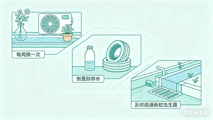 蚊虫宝宝(幼虫/孑孓)必须在水里长大,所以家里、社区的积水一定要清!花瓶、空调托盘、花盆底的水,每周换一次;空瓶、旧轮胎要倒置,别存水;社区的沟渠、地漏也要及时疏通,从根源断了蚊虫的“生路”。