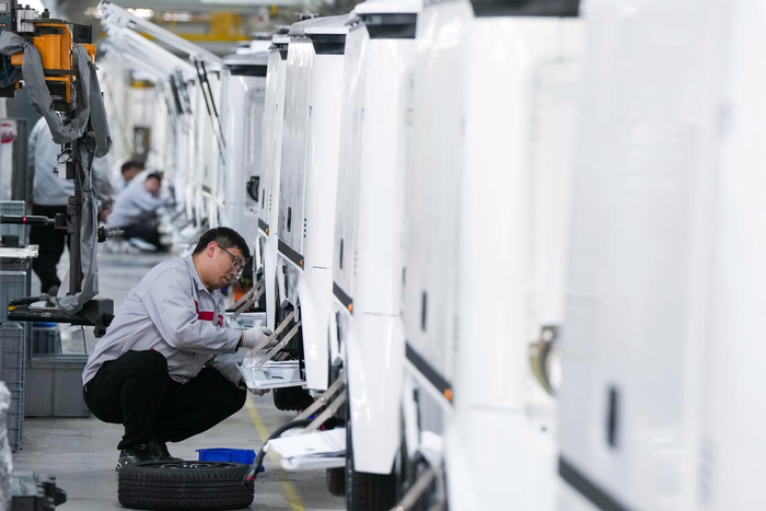 工人在新石器(盐城)智能制造有限公司无人车生产线上进行生产作业(3月25日摄)。新华社记者 李博 摄一季度规模以上装备制造业增加值同比增长8.9%,占规模以上工业增加值比重升至35.1%;高技术制造业增加值同比增长12.5%,对规模以上工业经济增长贡献率超30%;人工智能赋能千行百业,到3月,日均词元调用量突破140万亿。