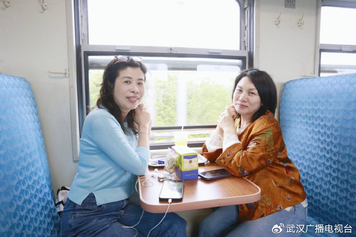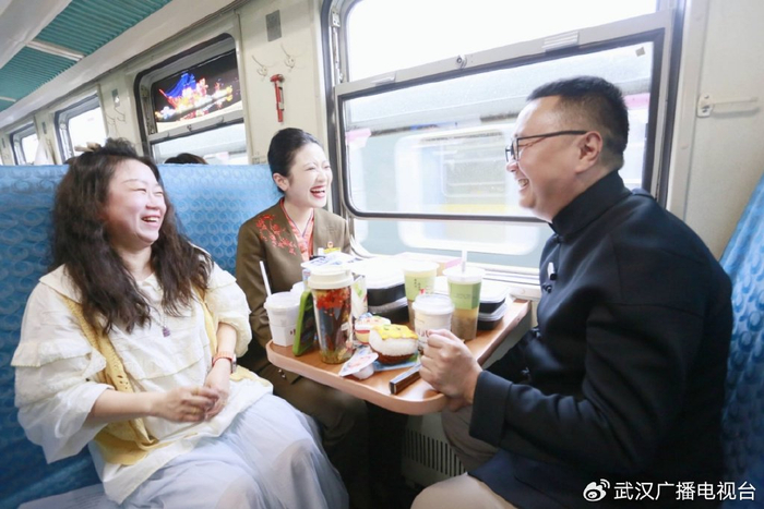 57岁的张先生坐在车厢里,激动得眼眶有点红。他是这趟环线列车的常客,更是《好吃佬》节目近20年的忠实听友。“我从2008年开车起就听陈哥讲武汉美食,每天必听。今天能在火车上见到他本人,还听他用地道武汉话报站、聊武汉文化故事,再看着窗外闪过的黄鹤楼、户部巷——就像跟老朋友一起逛家乡。”
