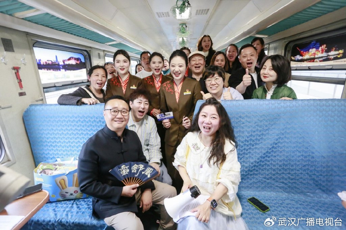 57岁的张先生坐在车厢里,激动得眼眶有点红。他是这趟环线列车的常客,更是《好吃佬》节目近20年的忠实听友。“我从2008年开车起就听陈哥讲武汉美食,每天必听。今天能在火车上见到他本人,还听他用地道武汉话报站、聊武汉文化故事,再看着窗外闪过的黄鹤楼、户部巷——就像跟老朋友一起逛家乡。”