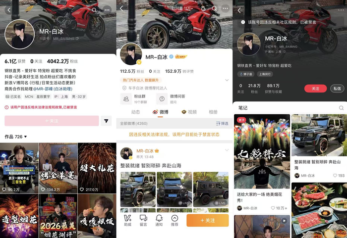4月28日午后,界面新闻查询发现,白冰抖音、微博、小红书等平台账号已被禁言。其中,白冰抖音账号显示“该用户因违反相关法律法规和政策,已被禁言”,该账号拥有粉丝超4000万;微博账号显示“因违反相关法律法规,该用户目前处于禁言状态”,账号粉丝为112.5万;小红书账号显示“该账号因违反相关社区规则,已被禁言”,账号粉丝21.8万。
