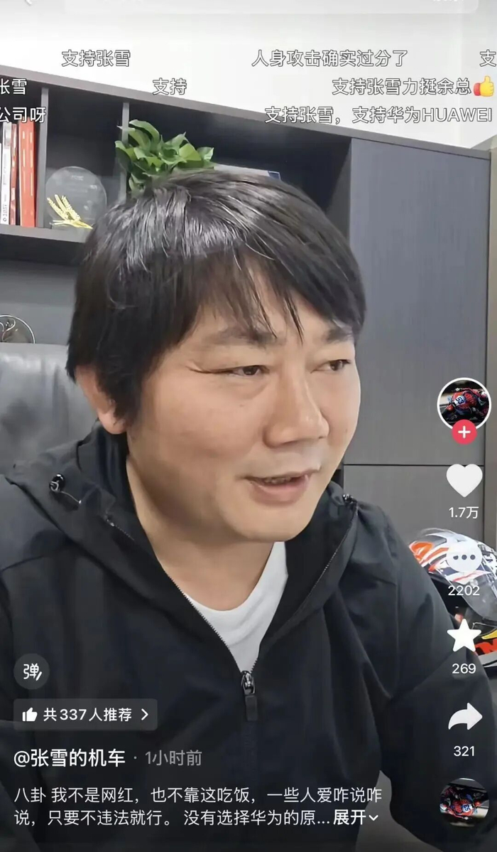 4月28日,张雪在其抖音号发布视频回应力挺余承东。他表示,“余承东发布会之前坐在那儿,(助理)递了杯水,被各种解读。我看不惯这个事情,我就说了一声。这两天有点热闹,还有说我想抱大腿的。”