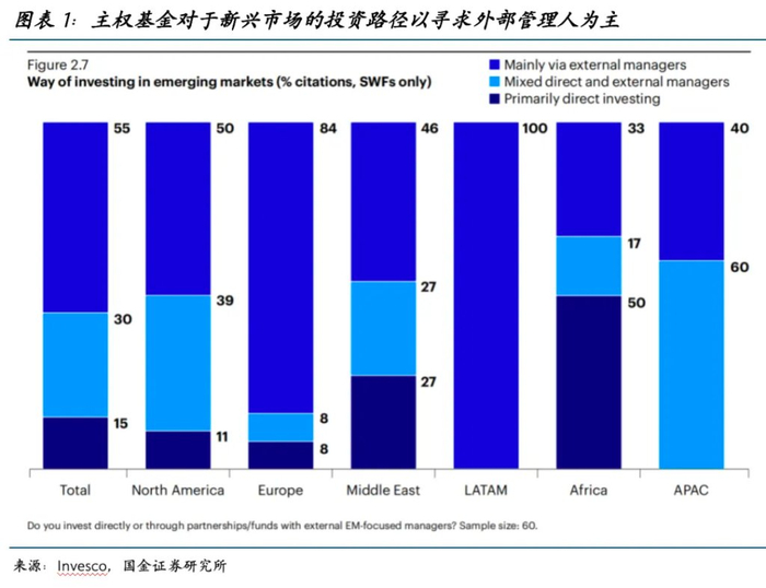 2025年Invesco主权财富基金调查显示,全球主权财富基金(SWFs)在布局新兴市场时,往往高度依赖于外部的主动管理机构,只有15%的主权财富基金倾向于通过直接渠道进行投资(图表1),且在新兴市场的投资以主动投资为主,被动投资较少(只有9%)。对于中国市场,主权财富基金的投资方向有二级股票市场(64%)、一级股权市场(49%)、涉华跨国企业(24%)、企业债券(22%)、政府债券(20%)等(图表2)。