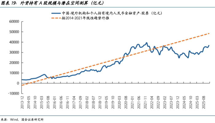 未来,不论是欧美外资还是中东外资,对于中国市场都仍有较大的增配空间。从央行口径下的境外机构和个人持有的人民币股票资产来看,截至2025年末,外资共持有3.67万亿元A股,距离2021年底的高点3.94万亿元,还有约7%的空间;若以2014-2021年的长期增长趋势进行线性外推,距离趋势线还有约24%的空间(图表19)。
