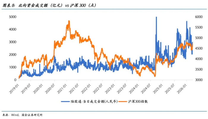 3)香港资金价格层面,HIBOR相对SOFR的非季节性下行表明,外部资金可能先进入了香港金融体系,但并未立即转化为港股或中国资产的配置。