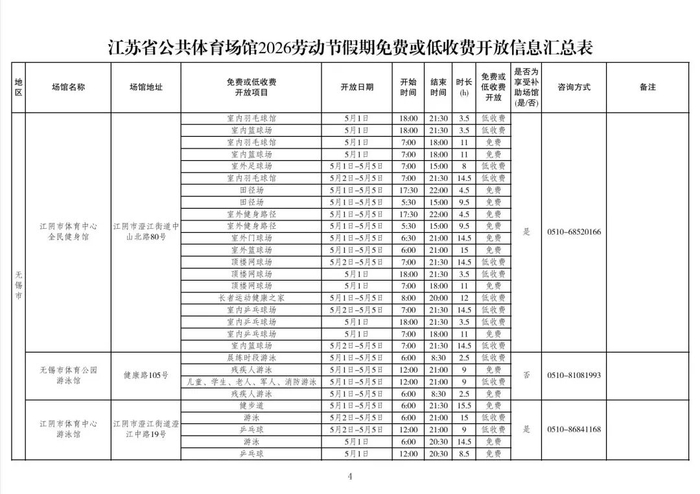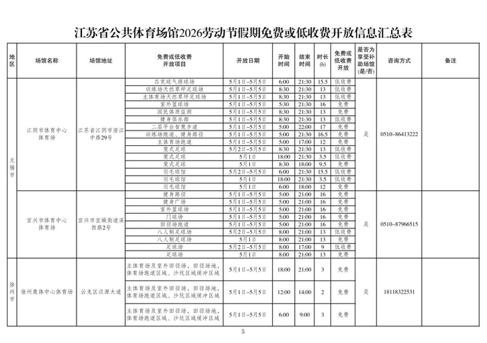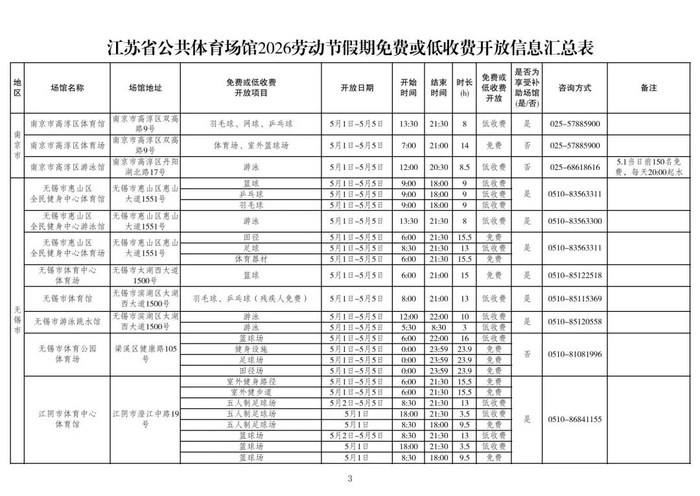 与此同时,江苏省公共体育场馆也持续落实惠民举措,结合劳动节假期安排推出免费或低收费开放服务,以下是江苏省公共体育场馆劳动节假期开放信息汇总。