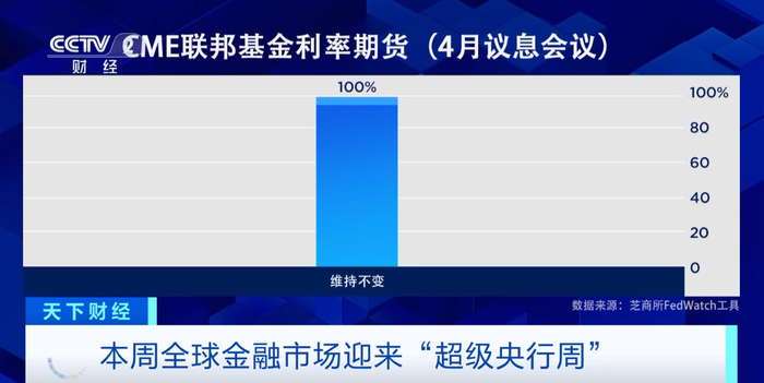 目前,各大央行正被夹在两大风险之间:一边是经济增长放缓,另一边则是通胀再度抬头,而此轮全球通胀主要由中东冲突导致的能源价格上涨推动。首先来看市场最为关注的美联储,芝商所的利率观察工具显示,目前市场押注100%的概率美联储本周会维持利率不变。