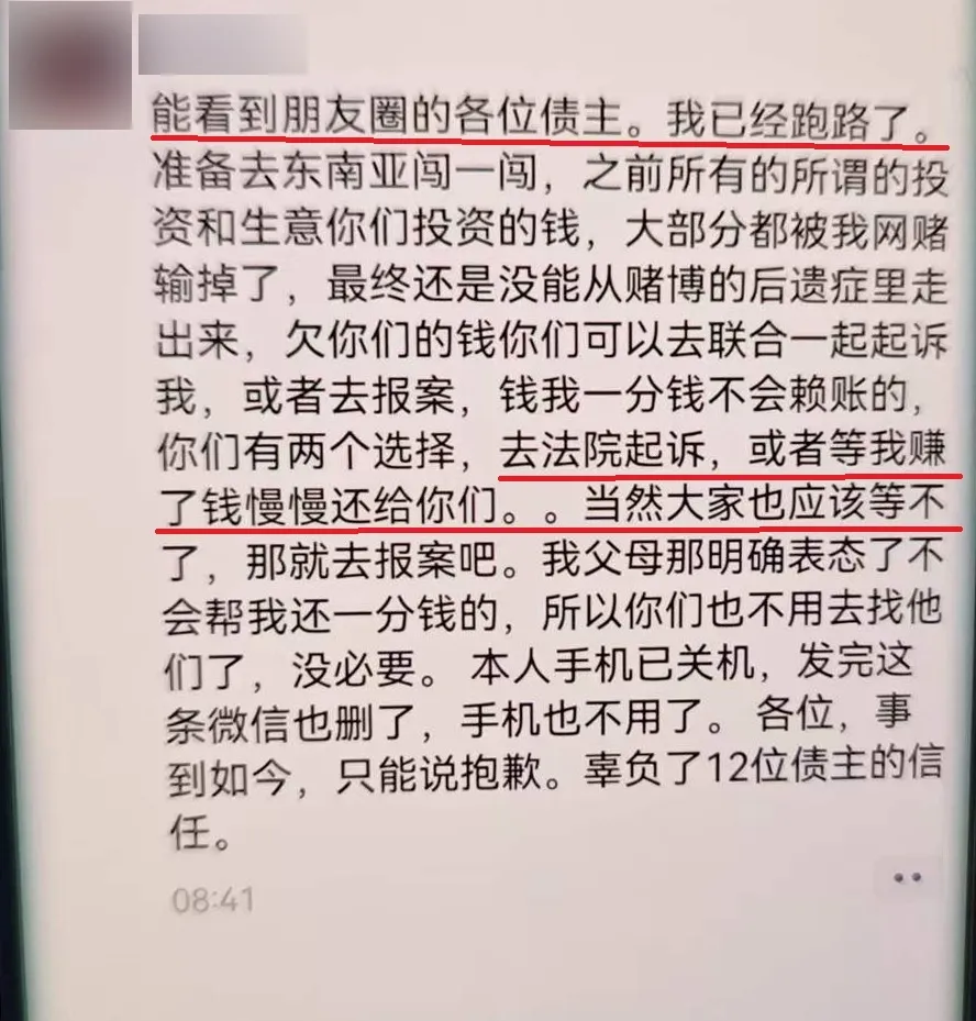 无力偿还百万欠款,男子发布朋友圈声称要一走了之。