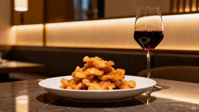 暖黄灯光下,侍酒师俯身在吧台前,向食客介绍今晚的酒饮,下一道菜端上来,是一道东北锅包肉,但服务员口中念着的或许是一个更高级的名字,摆盘更精致,佐着酒饮,价格在30元一片,甚至更高。