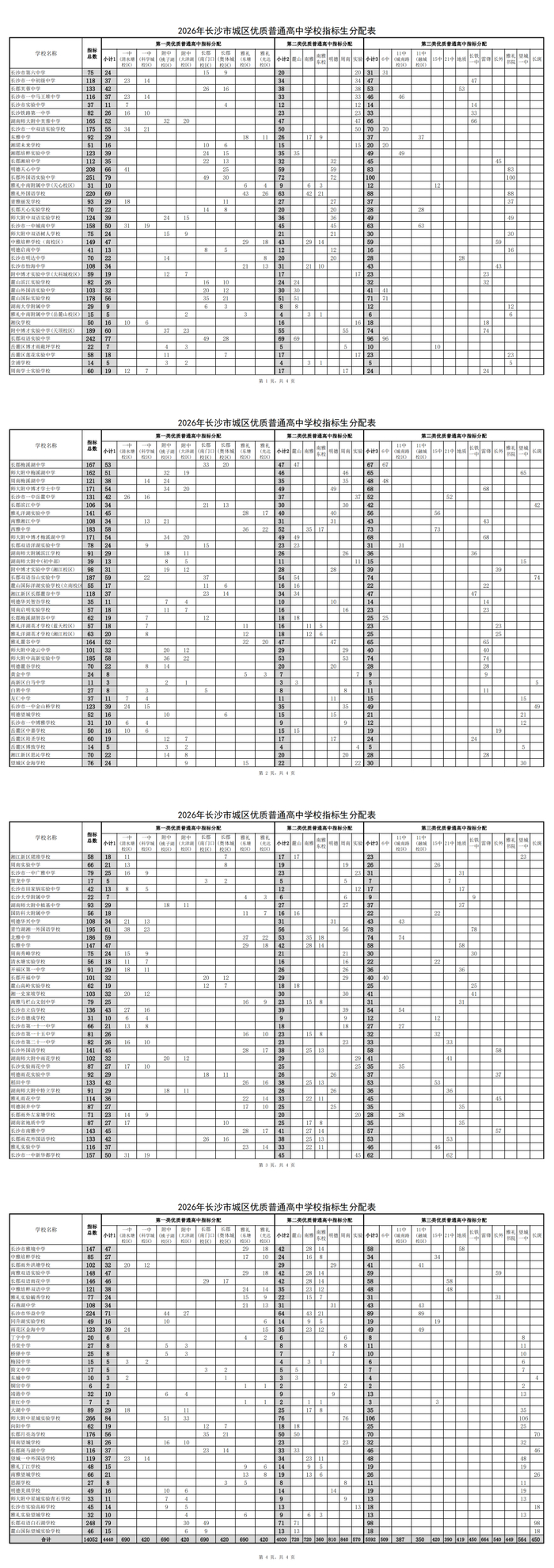 记者今日从长沙市教育局获悉,长沙市教育局发布2026年城区优质普通高中指标生计划相关通知,正式公布本年度城区优质高中指标生分配及填报实施方案,明确指标生学校分类、志愿填报规则、时间节点及公示报送要求,进一步规范中考指标生招生工作,保障招生公平公开透明。今年总指标为14052个,四大校本部均为690个,四大新校区均为420个。