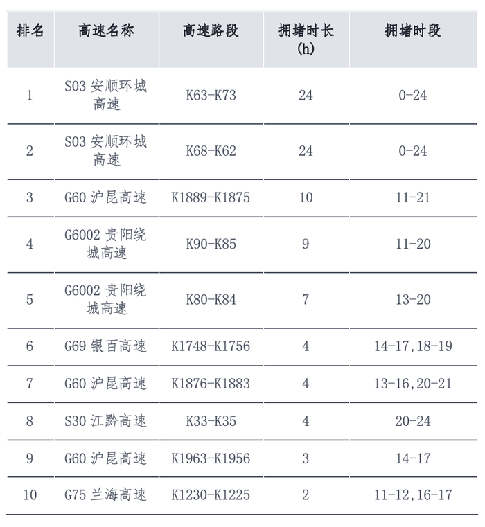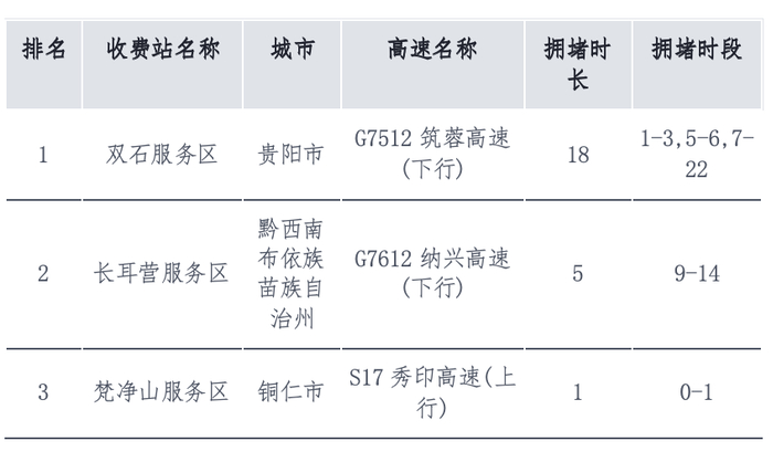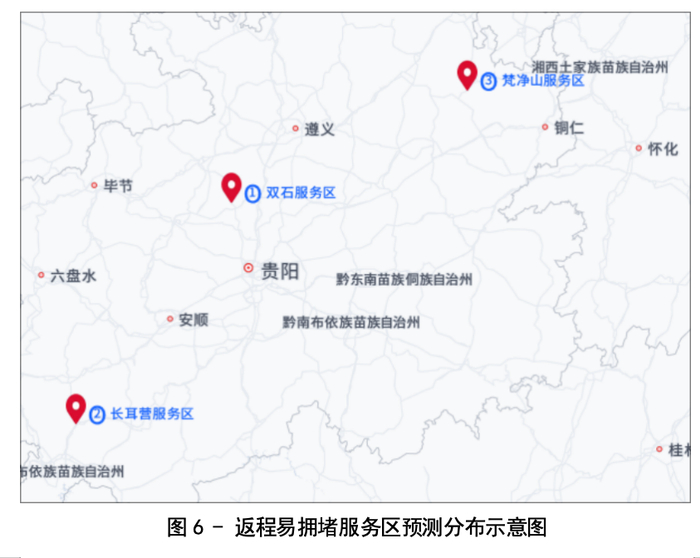 预计2026年“五一”期间返程高峰当日,省内高速较易拥堵的服务区主要有:G7512筑蓉高速(下行)-双石服务区、G7612纳兴高速(下行)-长耳营服务区、S17秀印高速(上行)-梵净山服务区等。