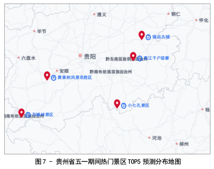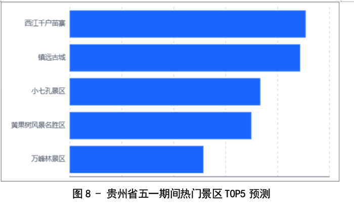 预计“五一”期间,西江千户苗寨最受欢迎,其次是镇远古城、小七孔景区、黄果树风景名胜区、万峰林景区等。